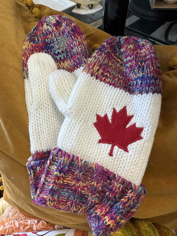 Knitted pink, blue, yellow and white mittens with a fuzzy red Canadian maple leaf on the center!