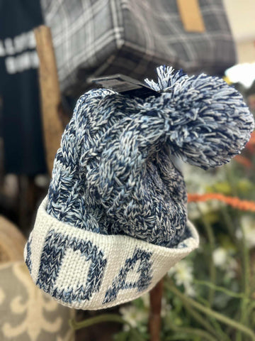 Knitted Canada beanie with a fuzzy interior and fun pom pom. Perfect to keep one warm all winter long. With dark and light blue flair!
