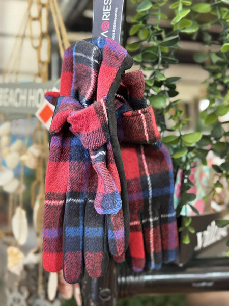 Soft Red, blue and black plaid Gloves. With a cute tie on the back and a phone-friendly finger.