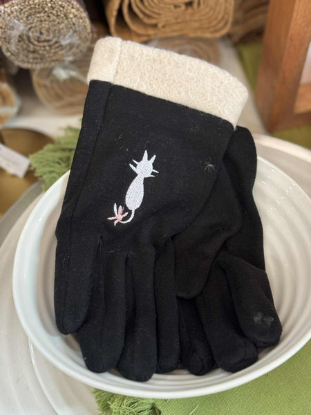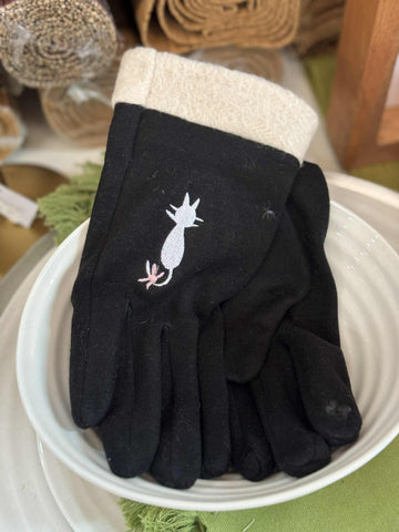 Classy Black and white gloves with a white cat and pink bow on the back. These gloves are also phone-friendly