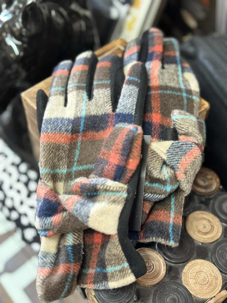 Soft rust, blue, beige and brown Plaid Gloves. With a cute tie on the back and a phone-friendly finger.