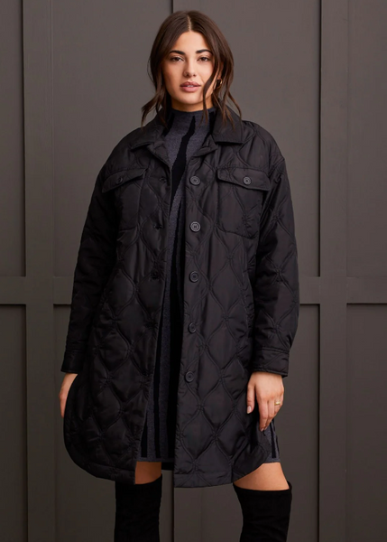 Brave chilly days with style and confidence in our sophisticated button-up jacket, featuring a cozy and stylish quilted design. Featuring timeless details such as a classic collared neckline, laid-back drop-shoulder sleeves, and practical patch pockets on the chest, along with convenient welt pockets at the sides, it effortlessly combines functionality with fashion. With a flattering 39" length, it's the perfect outerwear piece to elevate your cold-weather wardrobe.