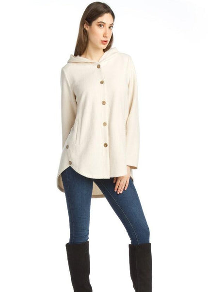 Hooded Button Up Stretch Jacket With Pockets And Side Button Detail