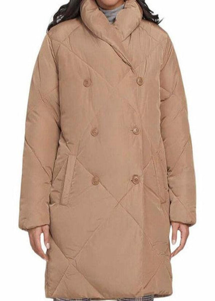 You can button the double breasted coat so that the neckline is closed via the shawl collar that gives style but allows you to hold out the frigid air. Warm and lightweight for the perfect coat to wear all winter long, no matter how low the temperature outside. Pockets in front and nice overall quilting. The length covers it all and will work well over a tunic or longer cardigan too.