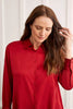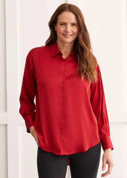 This button-up shirt takes two opposites and unites them in a way we never thought possible—an elegant flowy fit thanks to smooth satin fabric and a sharply-styled appearance with a crisply collared neckline. We love the long sleeves with button-adorned cuffs, drop shoulders, and high-low shirttail hem.