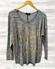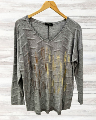 This sweater from Variations features a lightweight fabric enhanced with a distinctive foil print, combining comfort with a sophisticated metallic finish.