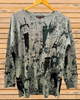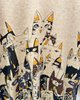 This sweater showcases a cat print in a refined palette of beige, grey, and black print.
