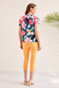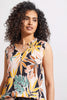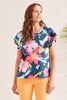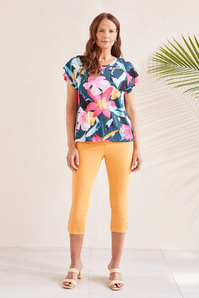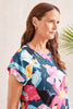 Bold florals define this crew neck top that sports a vibrant print and a 5/8'' neckband. Double ruffle short sleeves unfurl down from either shoulder while raglan armholes and printed rayon jersey fabric add a touch of easygoing flow and comfort.