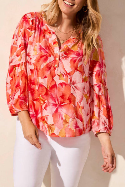 This 3/4 Sleeve Blouse from Tribal is the perfect addition to your wardrobe for SPRING 2025. Its smocked yoke adds a touch of elegance while the CORALSKY color adds a pop of color to your outfit. Stay on-trend with this versatile and stylish blouse.
