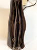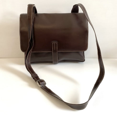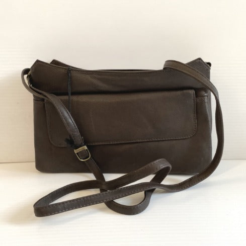 This is a brown leather bag with 2 main zipper pockets and 1 zipper pocket in the ffront and back side each. Moreover, it has 2 side pockets with velcro flap that makes its look stylish and unique.
