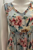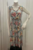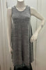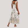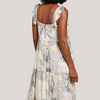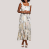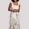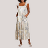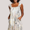 Ruffle strap, tiered, taupe/beige pattern. Flattering button accent on back