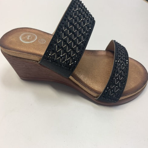 AE Slip on sandal with black rhinestones. Wedge heal and soft cushioned insole.