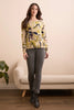 This sweater showcases a cat print in a refined palette of beige, grey, and black print.