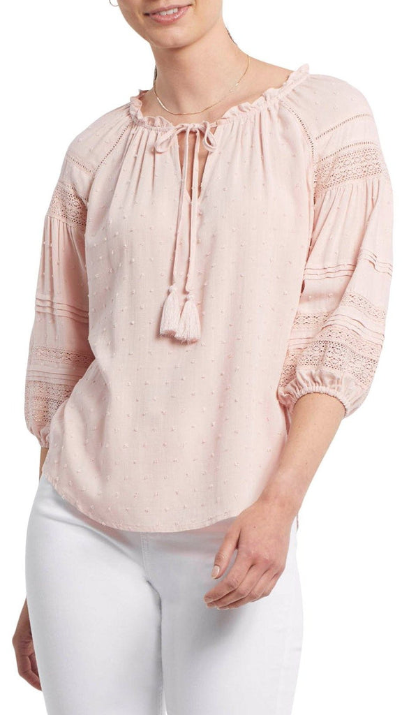 If we're talking about flowy feminine blouses, this pretty top is the centre of conversation! We can't get enough of the stylish design details—the swiss dot textured fabric sets the stage for a split neckline with a delicate tie, 3/4 length raglan sleeves, a curved hem, and gathering around the neck opening, all while the decorative crochet sleeve inserts add a romantic vibe that will instantly elevate any outfit this season.