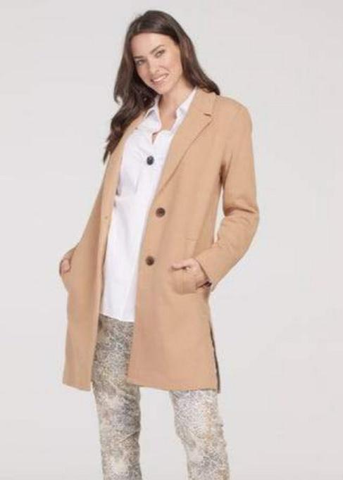 A long french terry jacket in a classic color gives a modern yet timeless vibe to this trendy top layer. Cut just above the knee, notched lapels, stylish striped lining and a gros grain trim gives you a chic option to top off your favorite look.