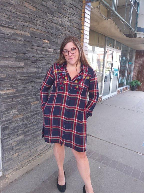 Tribal navy, red, green and white plaid button up dress with beautiful detailing and embroidery along the top.