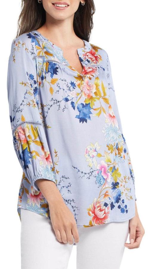 This stitched and stylish fabulous blouse is flowy and flattering for all figures. It features 3/4 elasticized sleeves, decorative ladder-stitching at the sleeves and bust, and a printed stretch challis material