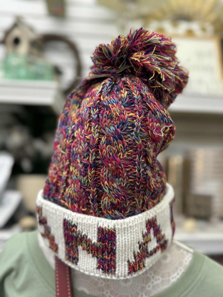 Knitted Canada beanie with a fuzzy interior and fun pom pom. Perfect to keep one warm all winter long. With pink, blue and yellow flair!