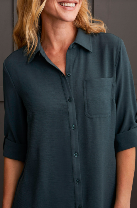 PEBBLED CREPE ROLL-SLEEVE TUNIC SHIRT-ALPINE GREEN