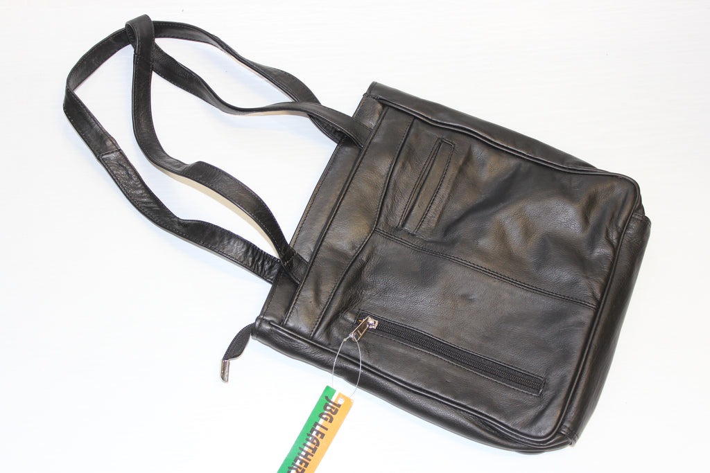 This is a black genuine leather shoulder bag with magnetic snap pockets on both the side- front and back. Also on the front side, there is a small open pocket and 1 vertical zipper pocket.The purse has 1 main zipper pocket section and the overall style of the purse is vintage.