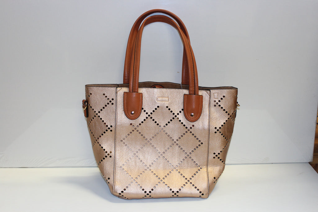 This is a Rose gold handbag made from textured shiny leather with camel colored handles. It has detachable crossbody pouch inside and it comes along with double straps. That makes it great for travelling also.