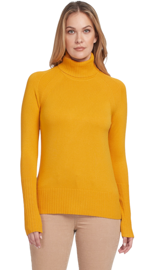 Soft knit with a great design. Lovely ribbing help define the shoulders, the extra long sleeves, and the bottom hemline. A true turtleneck.